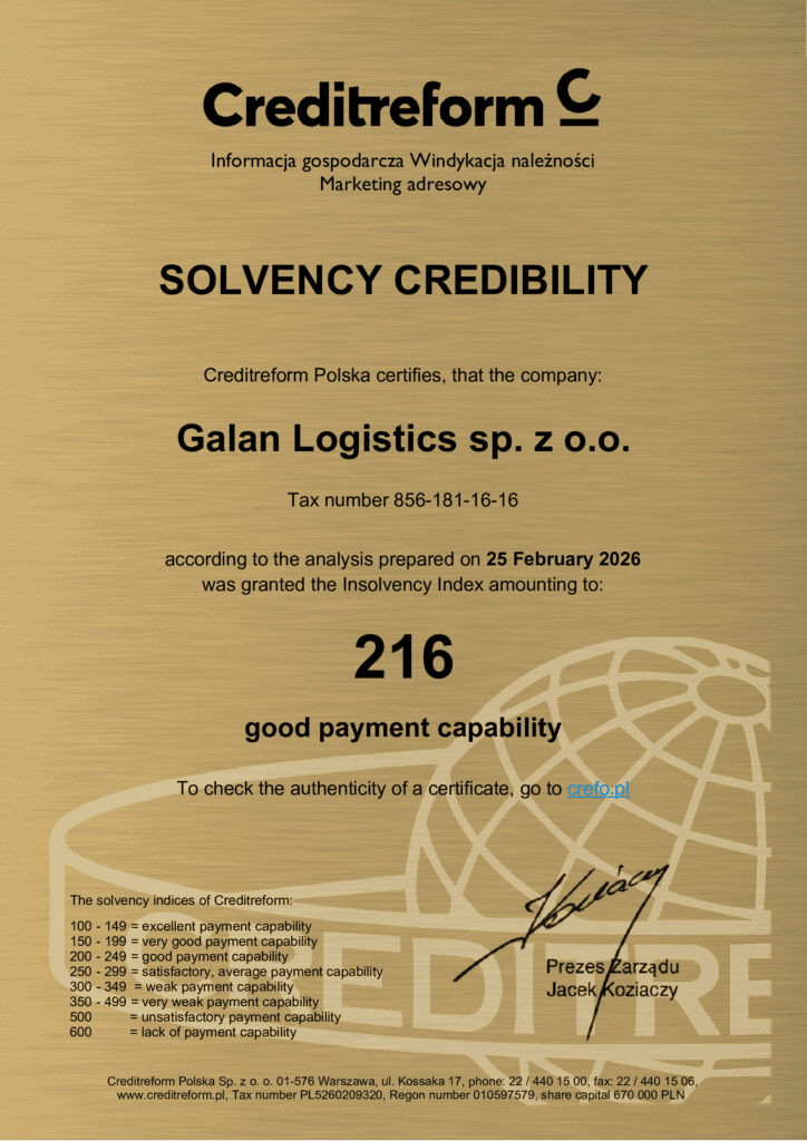 Galan Logistics, an experienced and rapidly growing transport and freight forwarding company, has once again been recognized with the prestigious Certificate of Reliability awarded by Creditreform Polska.